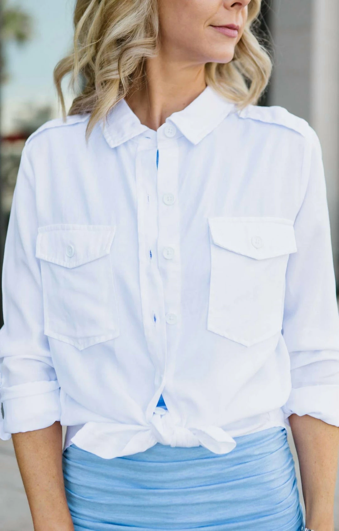 Details – Safari style long sleeveAdjustable sleevesTab shoulder detailsFull button frontFront pockets with button closureRounded rear hemDart pleat on backSoft, tencel fabricVersatile separate that can be worn to the office or with jeans or shortsModel Details – Height – 5’4″Bust – 32″Waist – 26″Hips – 32″Wearing size XSCare Instructions – Machine wash coldLike colorsNon-chlorine bleachHang dryLow heat iron if neededÂ