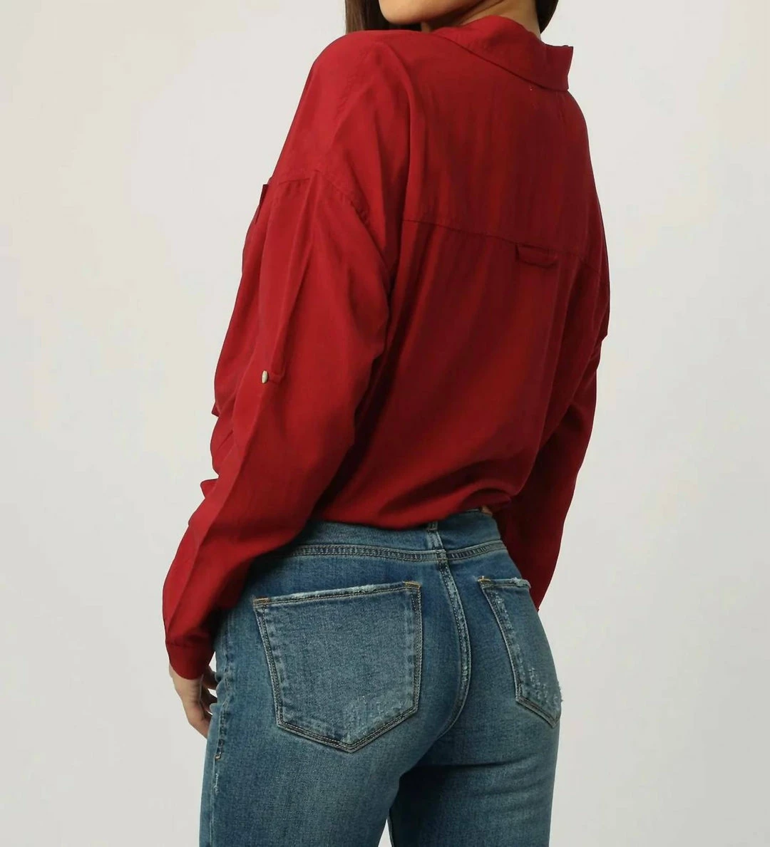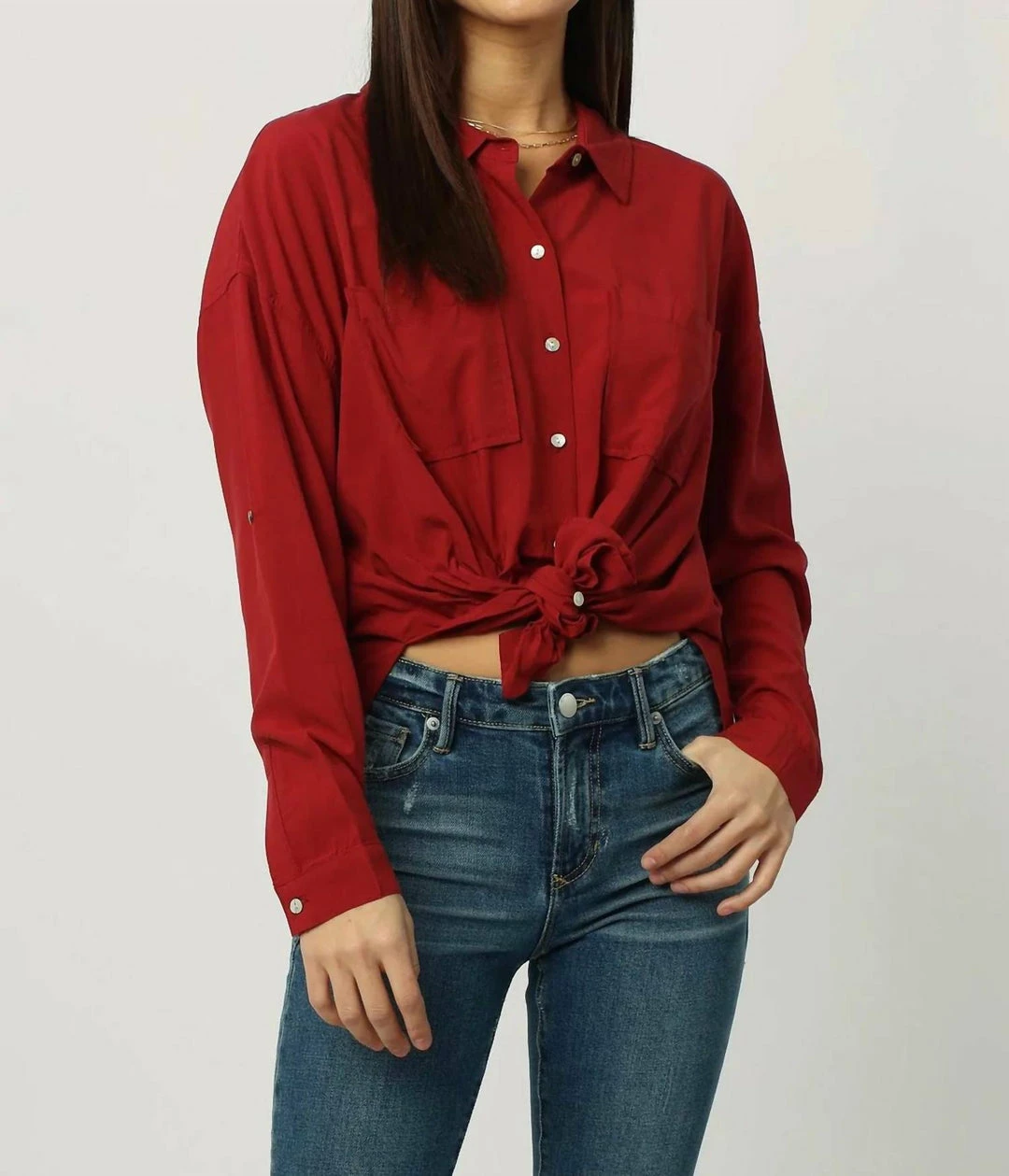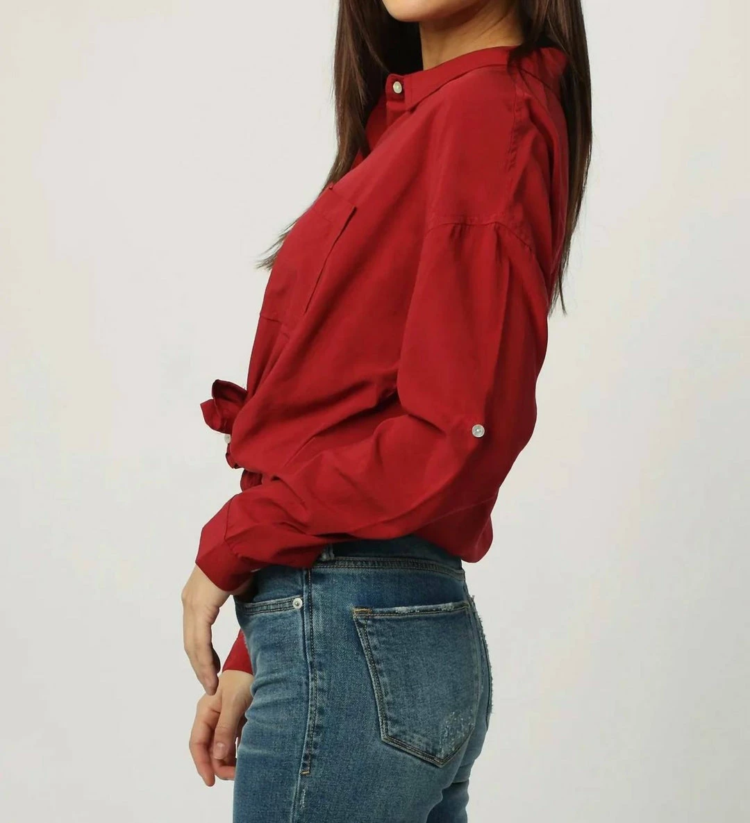 Front tie shirt with drop shoulder, long sleeve button front finished with cuff band, high side slit, back yoke.