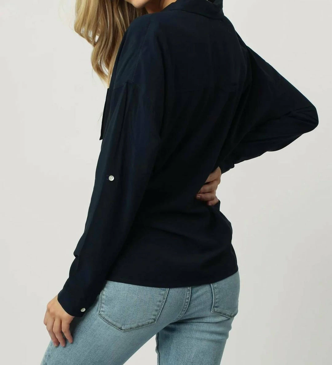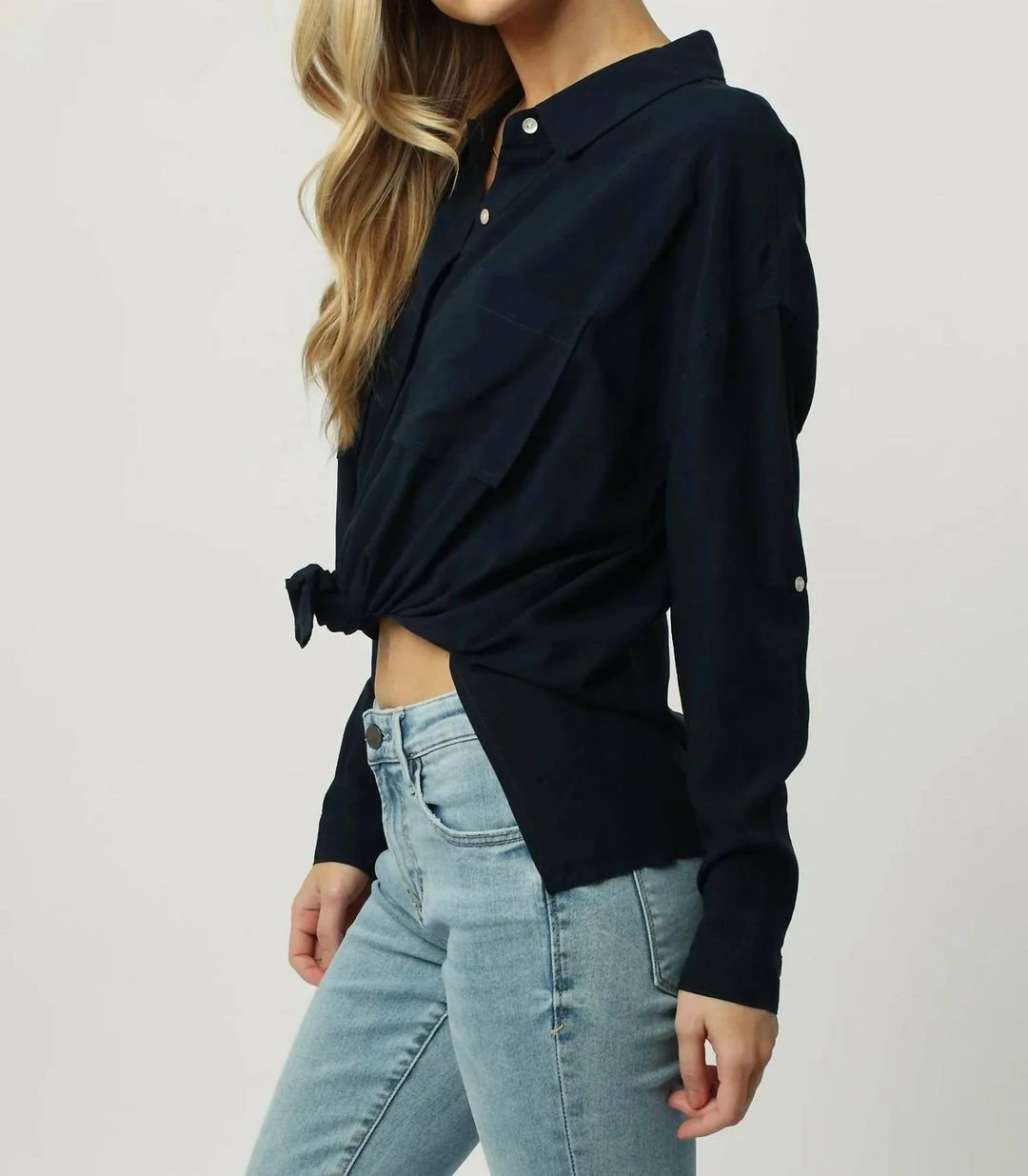 Front tie shirt with drop shoulder, long sleeve button front finished with cuff band, high side slit, back yoke.