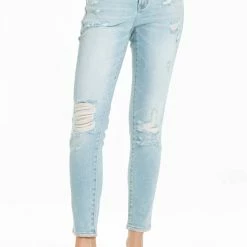 Mid rise ankle skinny jeans. It’s the glamorous fit that sits lower on the waist and fits skinny in the hips through the leg. Ankle inseam on comfort stretch denim accented with destructions along front panel & pockets, hand sanding whiskers at hip & back knee, and select grindings.8 1/2″ Front Rise (include waistband), 10″ Leg Opening, 28″ inseam (Size 27)Machine wash cold, Tumble dry lowImportedZip fly and button closureFive-pocket style