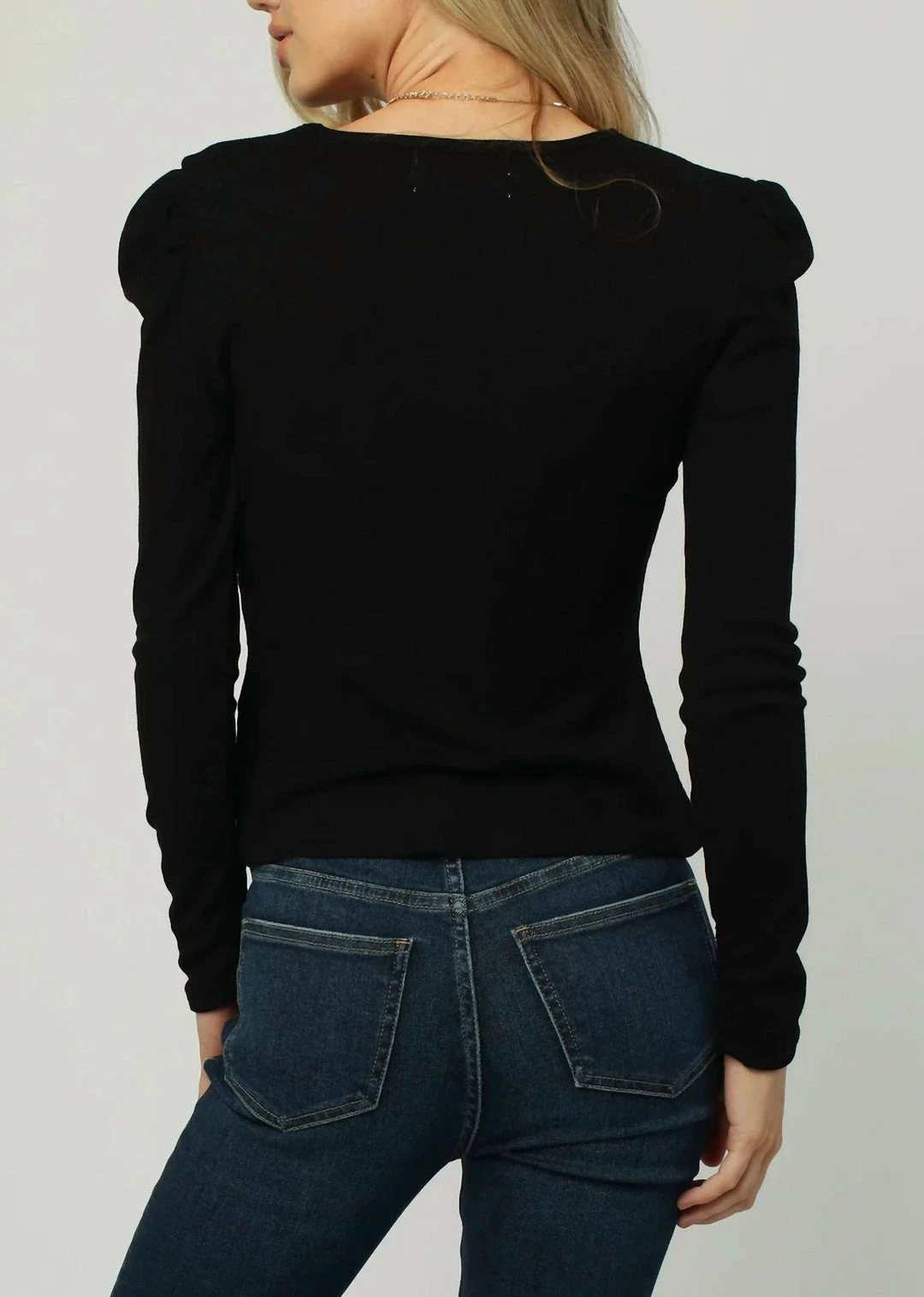 Long sleeve crew neck top with puff shoulder detail.