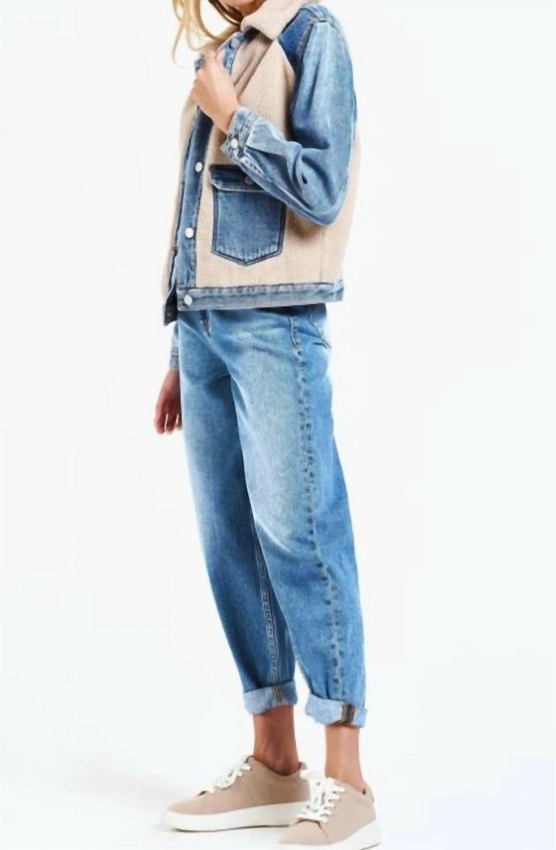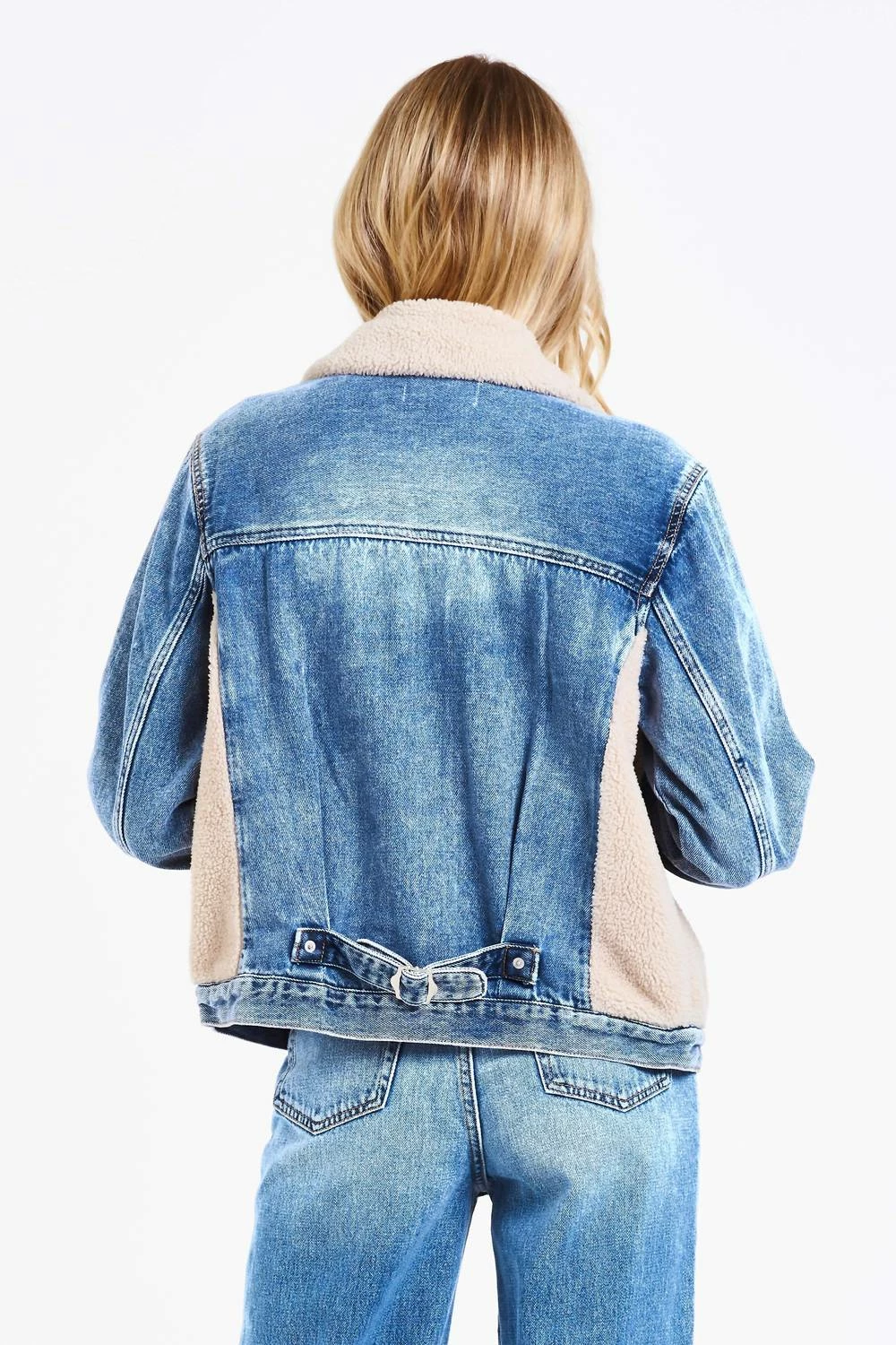 Sherpa fleece denim jacket, button front long sleeve finished with front flap pockets, cuff & waistband, adjustable waist strap & buckle. Mix Media of medium wash rigid denim (non-stretch) & sherpa fleece on relaxed fit, styled with metallic logo shank buttons.
