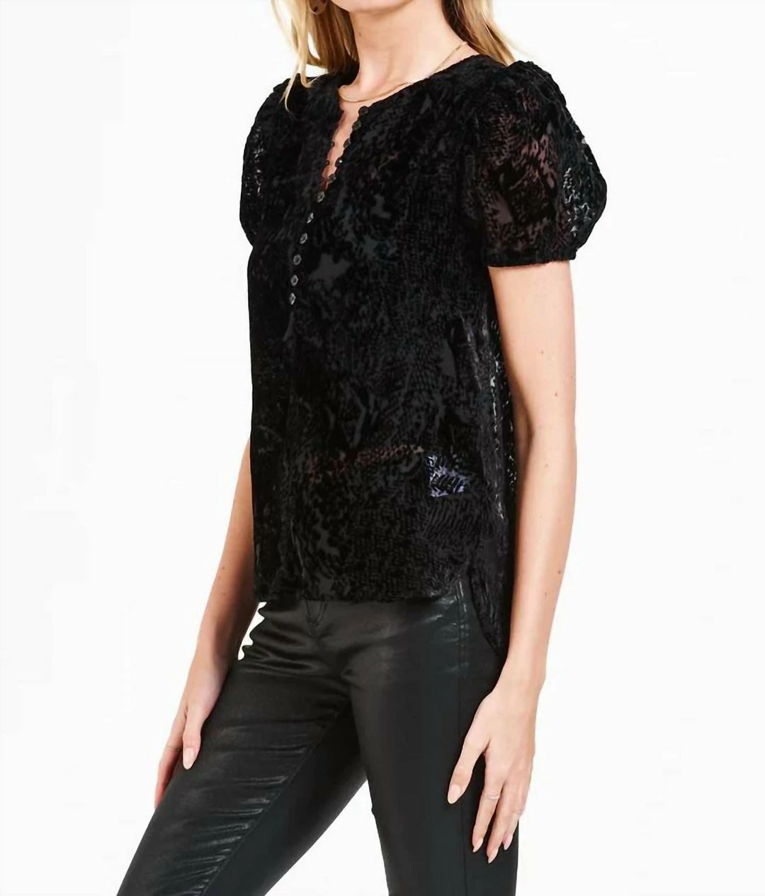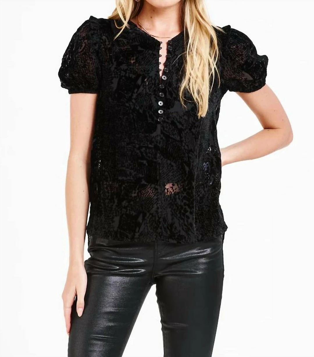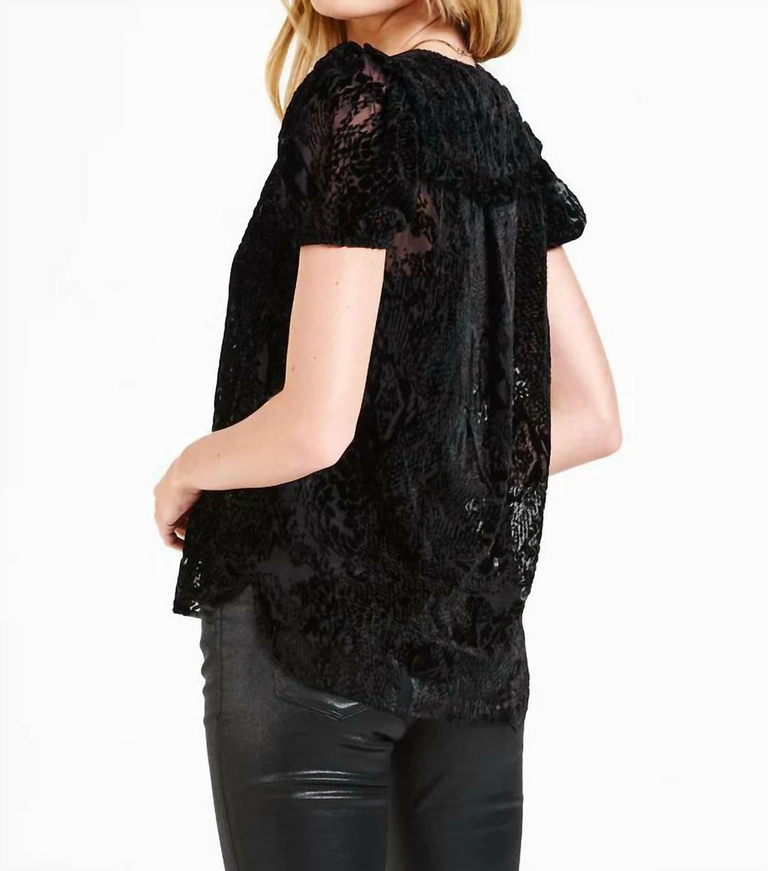 Puff short sleeve top, button neck finished with elastic cuff, raw edges at shoulder & back yoke, hi-low curved hem. Elegant print on mesh! Solid print woven on standard fit.Body length from HPS – 24″, Sleeve length – 9 1/2″, Bust – 37″ (Size Small)Hand wash cold, Dry flatImported