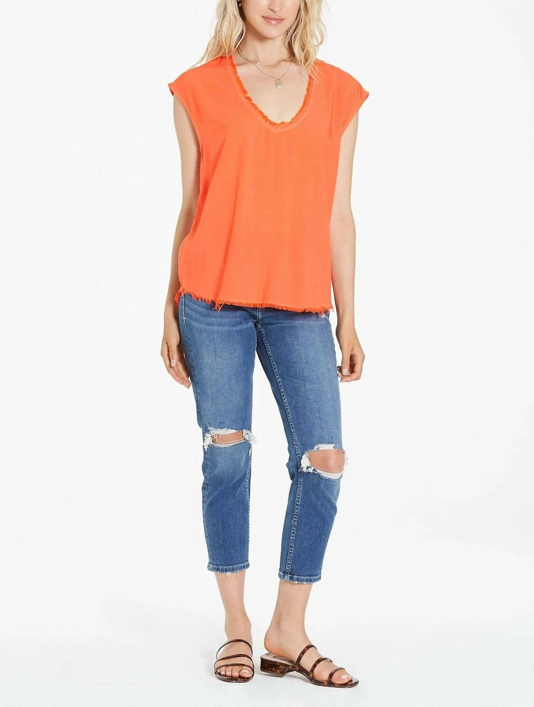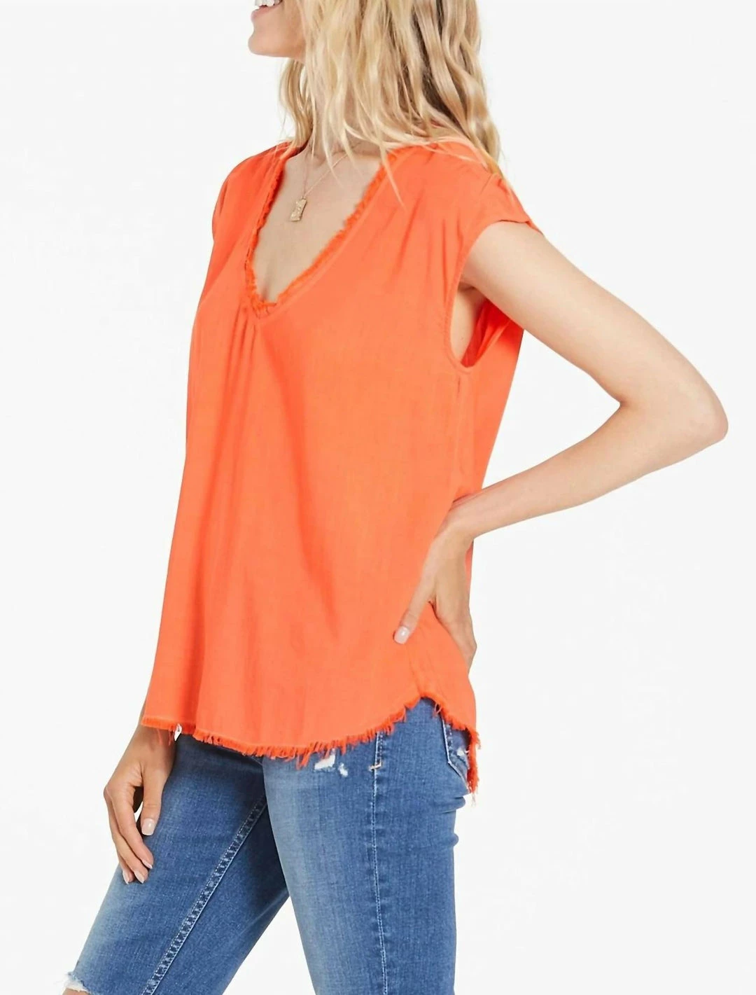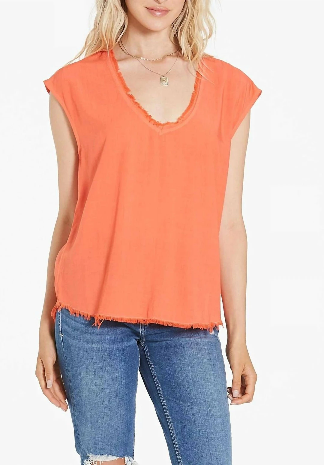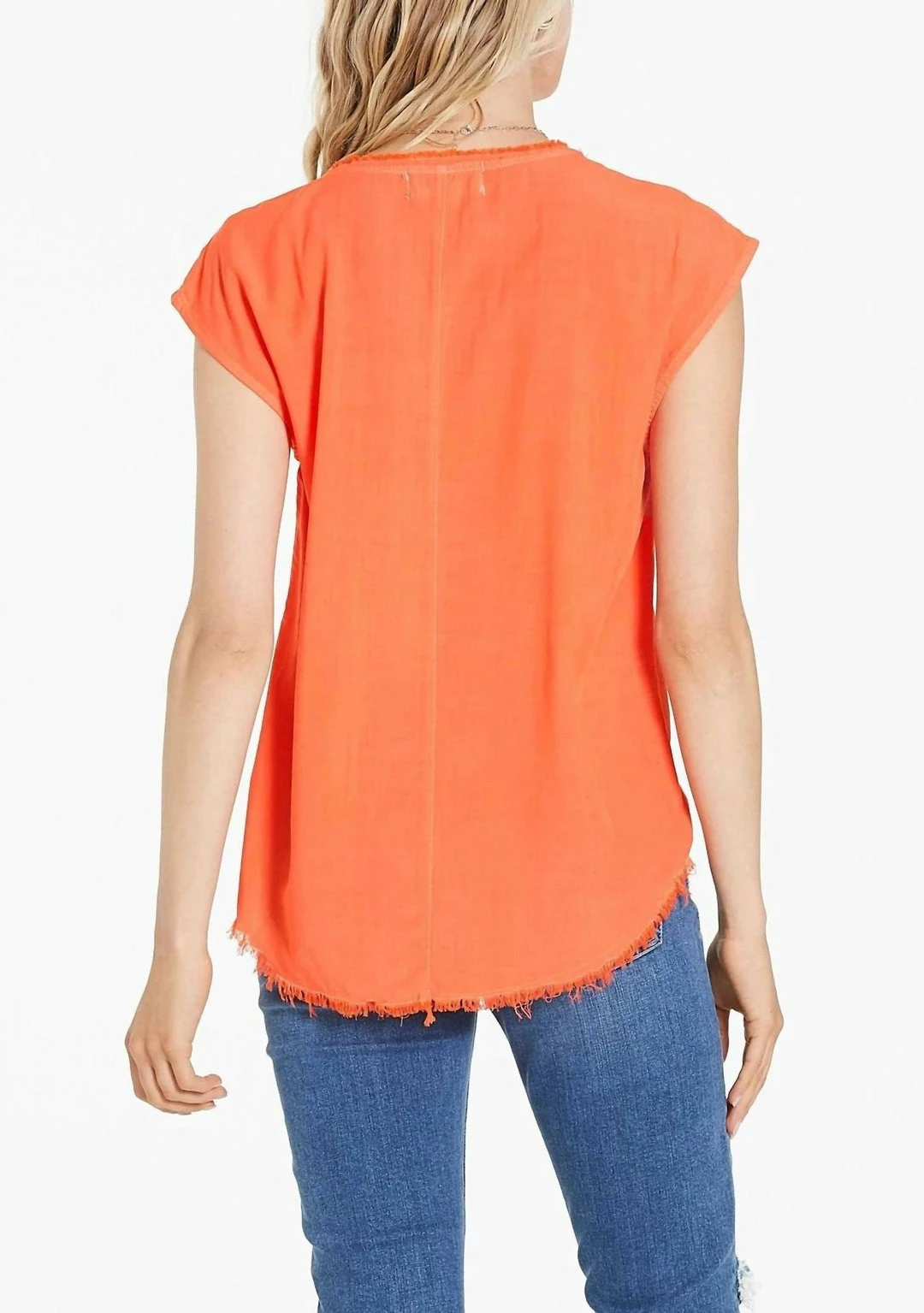 Lyocell Breatheable, Frayed Neck & Hem, V-Neck Top Finished Sleeveless. Solid Color Woven On Relaxed Fit, Styled With Center Back Seam.