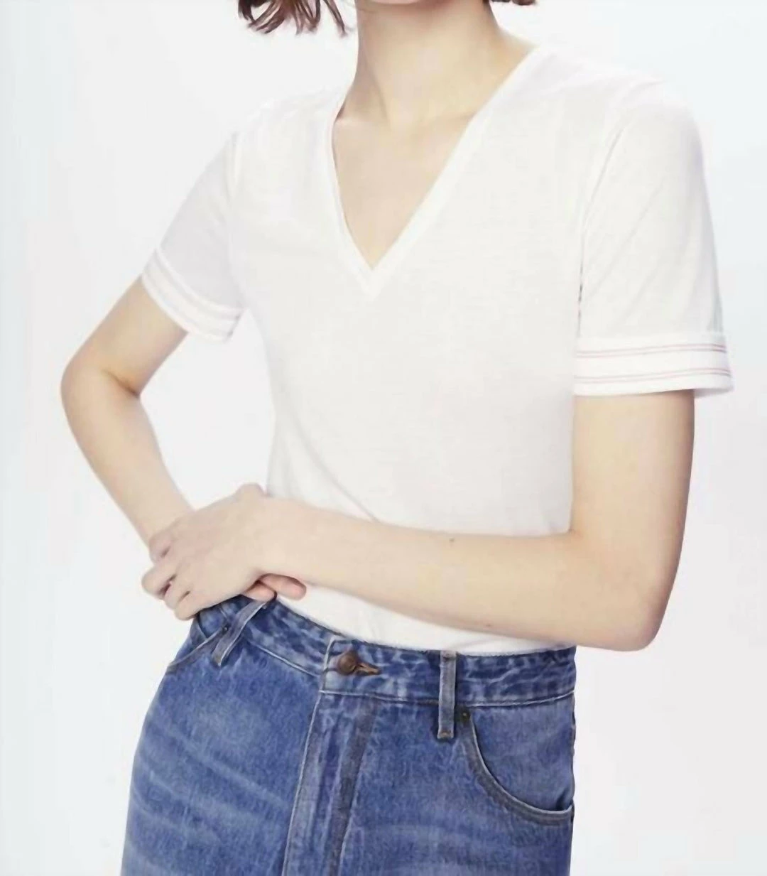 ELEVATED TO PERFECTION, THE CLASSIC WHITE TEE GETS AN UPGRADE FROM VICTORIA BECKHAM. FEATURING SHORT SLEEVES, V-NECKLINE, FIXED CUFFS AND RED CONTRAST STITCHING. CRAFTED FROM LIGHTWEIGHT COTTON, THIS SLIM CUT FIT IS THE PERFECT TUCKED TEE AND JEANS ENSEMBLE FOR EVERYDAY WEAR.